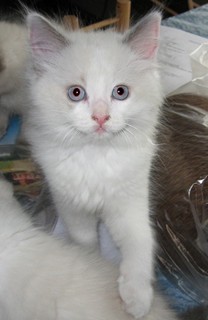The Ragdoll cat comes in very specific patterns and in various pointed colors. Ragdolls are blue-eyed pointed cats. The definition of a pointed cat is one with darker pigment on the extremities. The color is actually temperature-sensitive, so it gets darker on the cooler parts of the cat, which is its extremities. With Ragdolls, white may overlay some of the points in certain patterns. Other blue-eyed, pointed breeds are the Siamese and Himalayan.